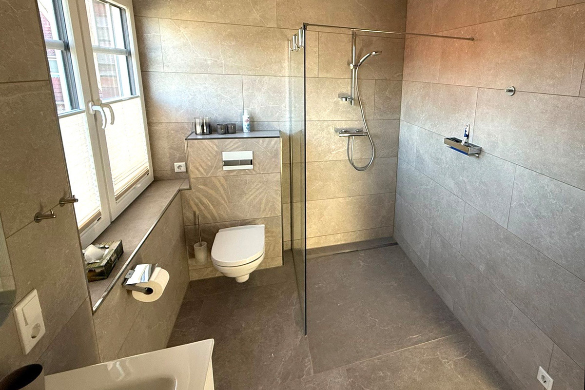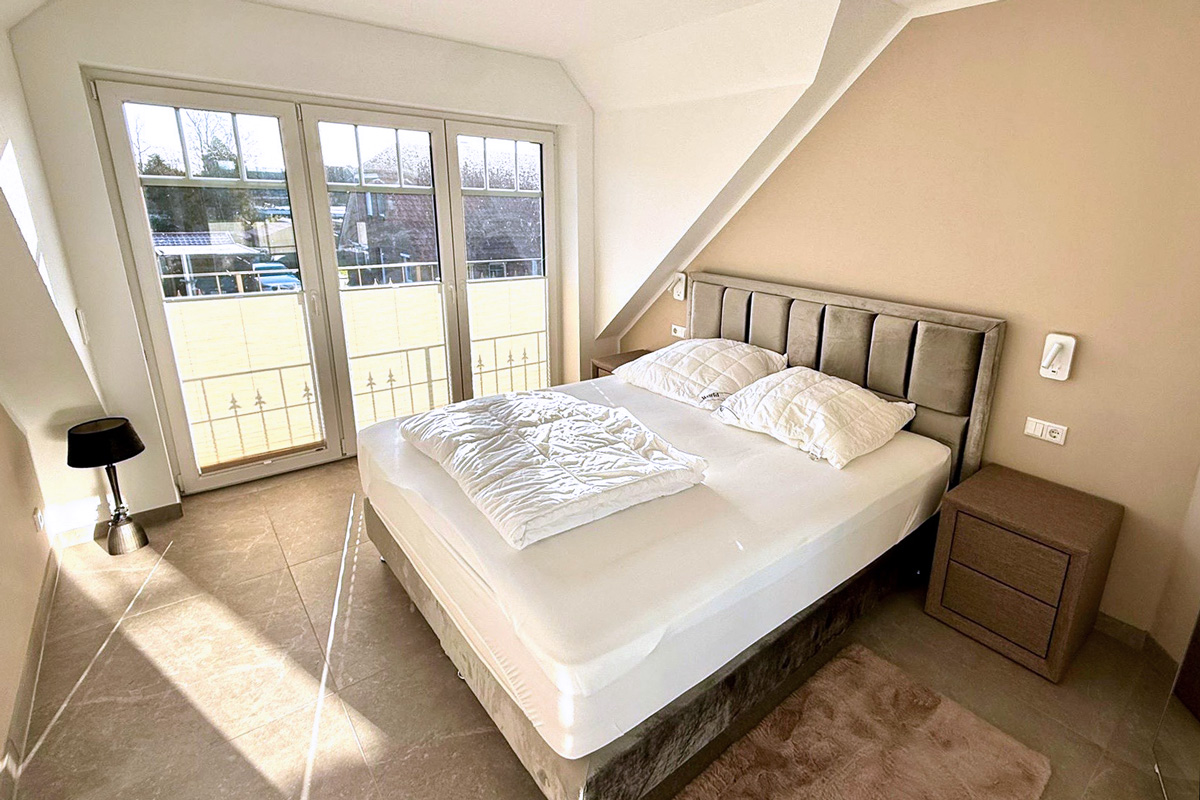Im Obergeschoss setzt sich der gehobene Anspruch fort: Das luxuriöse Master-Schlafzimmer überzeugt mit direktem Zugang zur sonnigen Balkonterrasse. Zwei weitere Schlafzimmer bieten vielseitige Nutzungsmöglichkeiten – eines davon mit eigener Ankleide und stilvoller Loggia im französischen Stil. Das elegante Badezimmer mit bodengleicher Dusche, exklusiver Ablaufrinne und Tageslicht unterstreicht den hohen Qualitätsstandard auf eindrucksvolle Weise.