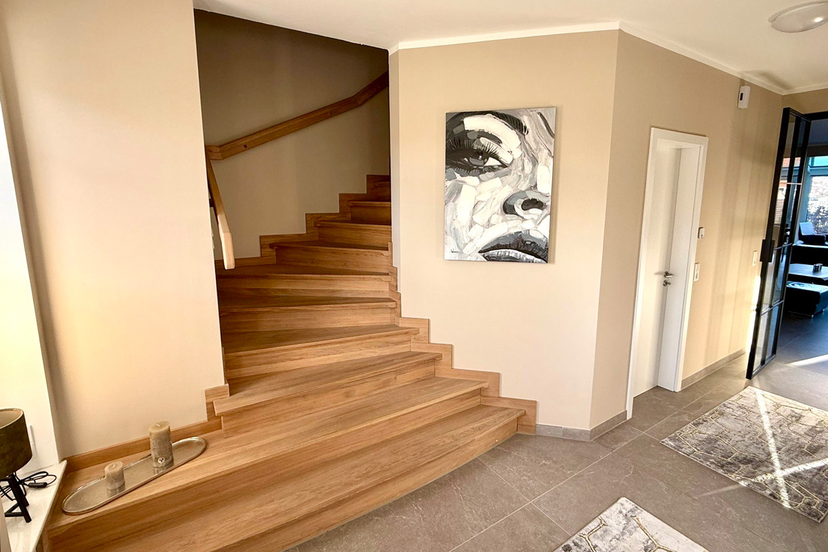 Hochwertige Fenster mit 3-fach-Verglasung, elektrische Rollläden sowie eine moderne BUDERUS-Wärmepumpe der Effizienzklasse A+ garantieren höchsten Wohnkomfort bei maximaler Energieeffizienz. Eine zentrale Be- und Entlüftungsanlage in sämtlichen Räumen sorgt ganzjährig für ein angenehmes Raumklima. Stilvolle weiße Innentüren, eine durchdachte LED-Beleuchtung und die individuell gefertigte Design-Treppe setzen architektonische Akzente und unterstreichen den exklusiven Anspruch der Immobilie.