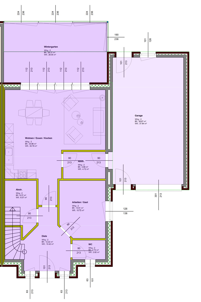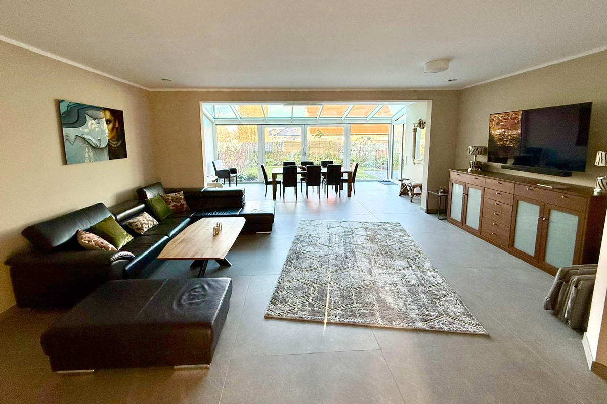 Bereits der repräsentative Eingangsbereich vermittelt ein Gefühl von Großzügigkeit und Exklusivität. Die kunstvoll gestaltete Treppe bildet das architektonische Highlight und führt stilvoll in das Obergeschoss. Im Erdgeschoss erwartet Sie ein hochwertiges Gäste-WC sowie eine großzügige Wohnküche mit exklusiver Design-Einbauküche. Ausgestattet mit BORA-System, Induktionskochfeld, Weinkühlschrank und weiteren Premiumgeräten wird sie zum Mittelpunkt des Hauses. Das weitläufige Wohnzimmer mit angrenzendem, offenem Wintergarten schafft ein lichtdurchflutetes Wohnambiente und eröffnet durch bodentiefe Fenster einen traumhaften Blick auf die Terrasse und den liebevoll gestalteten Garten. Die direkt angeschlossene, großzügige Garage bietet komfortabel Platz auch für SUVs oder größere Fahrzeuge.